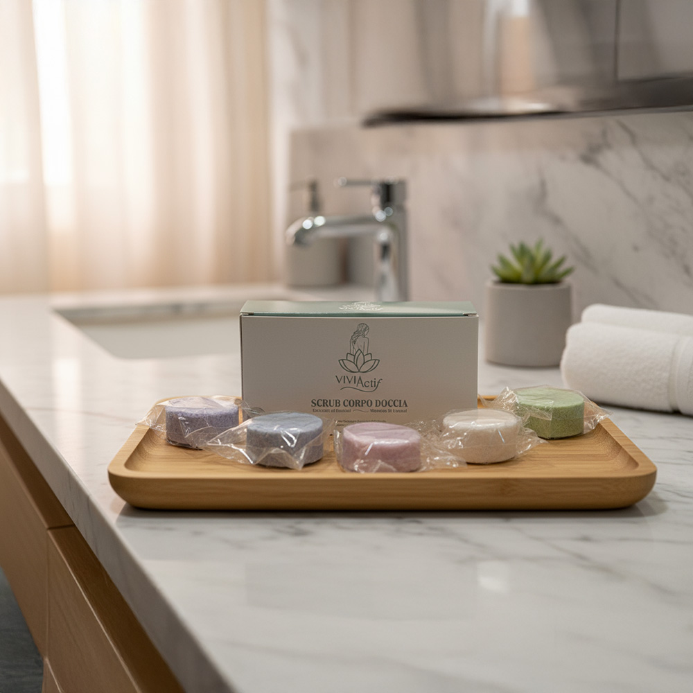 Inumidire il corpo e passare il disco scrub con movimenti circolari. Risciacquare con acqua tiepida.